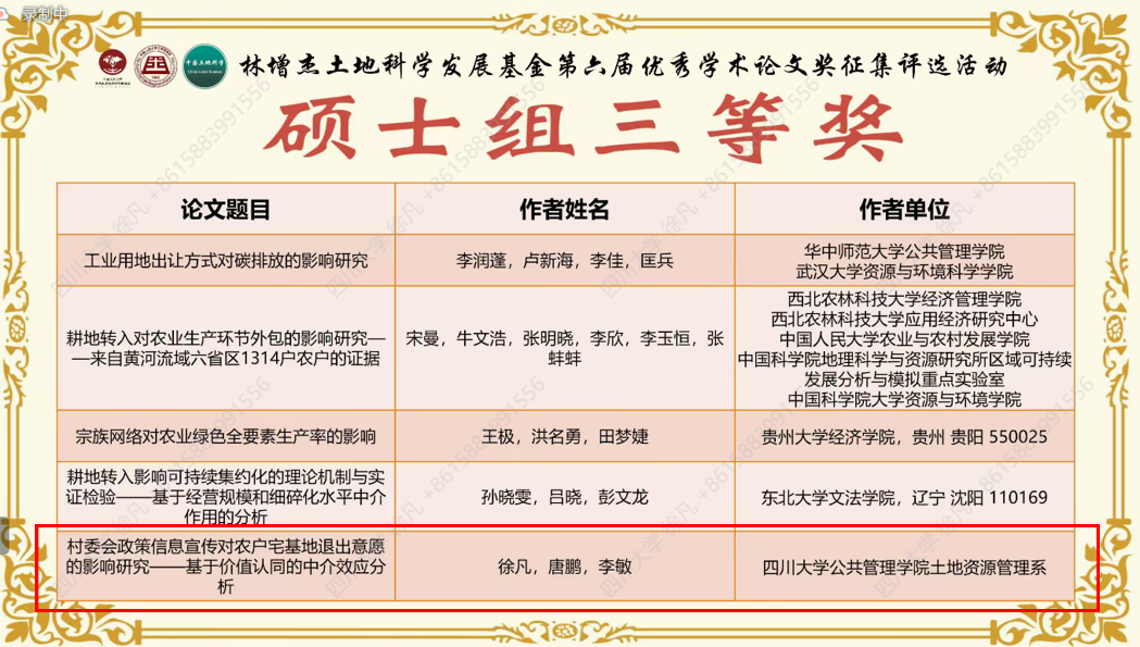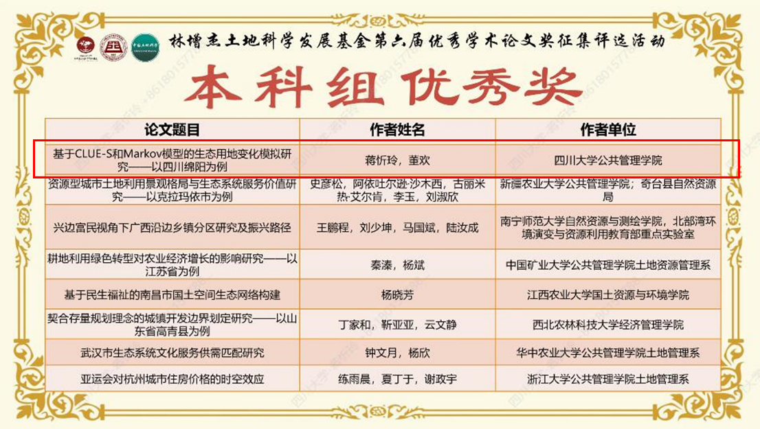 在唐鹏老师、李敏老师、董欢老师的悉心指导下,土地资源管理系2022级硕士研究生徐凡同学撰写的论文《村委会政策信息宣传对农户宅基地退出意愿的影响研究——基于价值认同的中介效应分析》获得研究生组三等奖,2019级本科生蒋忻玲同学撰写的论文《基于CLUE-S和Markov模型的生态用地变化模拟研究——以四川绵阳为例》获得本科组优秀奖。