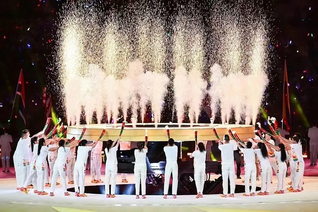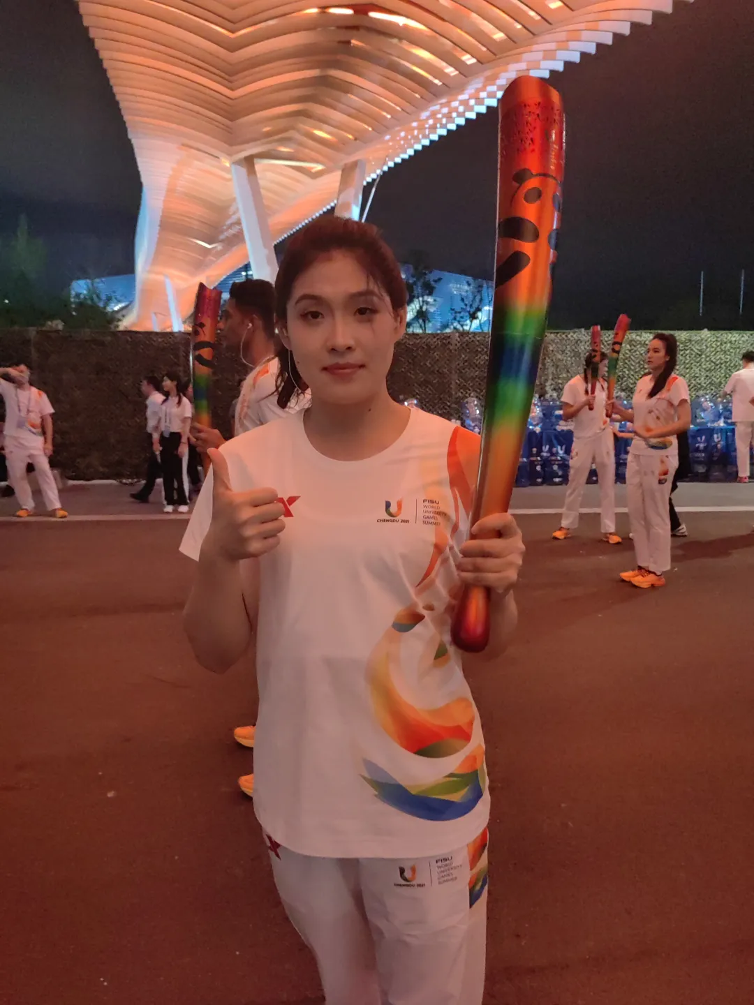 开幕式上最精彩难忘的,便是火炬台点火仪式,她说道:“火炬方阵变成了两列纵队向火炬台跑进,31名火炬台围成一个圆共同前进点燃火炬塔,烟火也随之四溅、冉冉升起。当圣火被点燃的那一刻激动与喜悦在脸上体现得淋漓尽致,非常荣幸、也十分有幸能够作为川大学子的代表参加开幕式火炬传递活动,这既是对我的一种认可与鼓励,更是激励我向更远、更高的舞台勇往直前。”