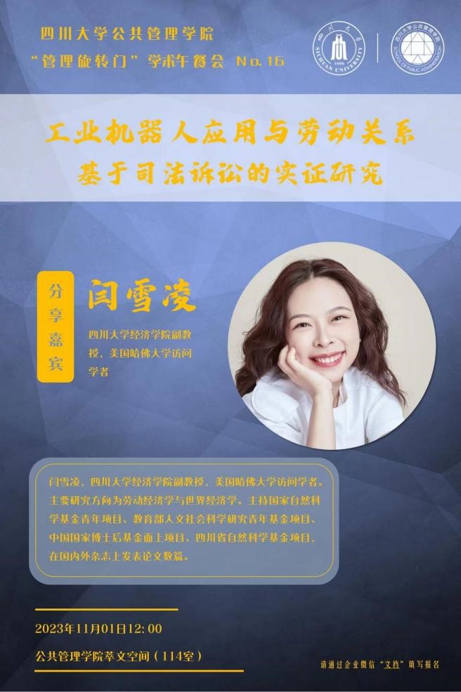 11月1日,澳门太阳成集团在学院萃文空间开展第16期“管理旋转门”学术沙龙活动。本期沙龙特邀澳门太阳成集团经济学院副教授,美国哈佛大学访问学者闫雪凌作为主讲嘉宾,分享“工业机器人应用与劳动关系:基于司法诉讼的实证研究”。学院各学科老师、研究生等积极参加了此次交流。