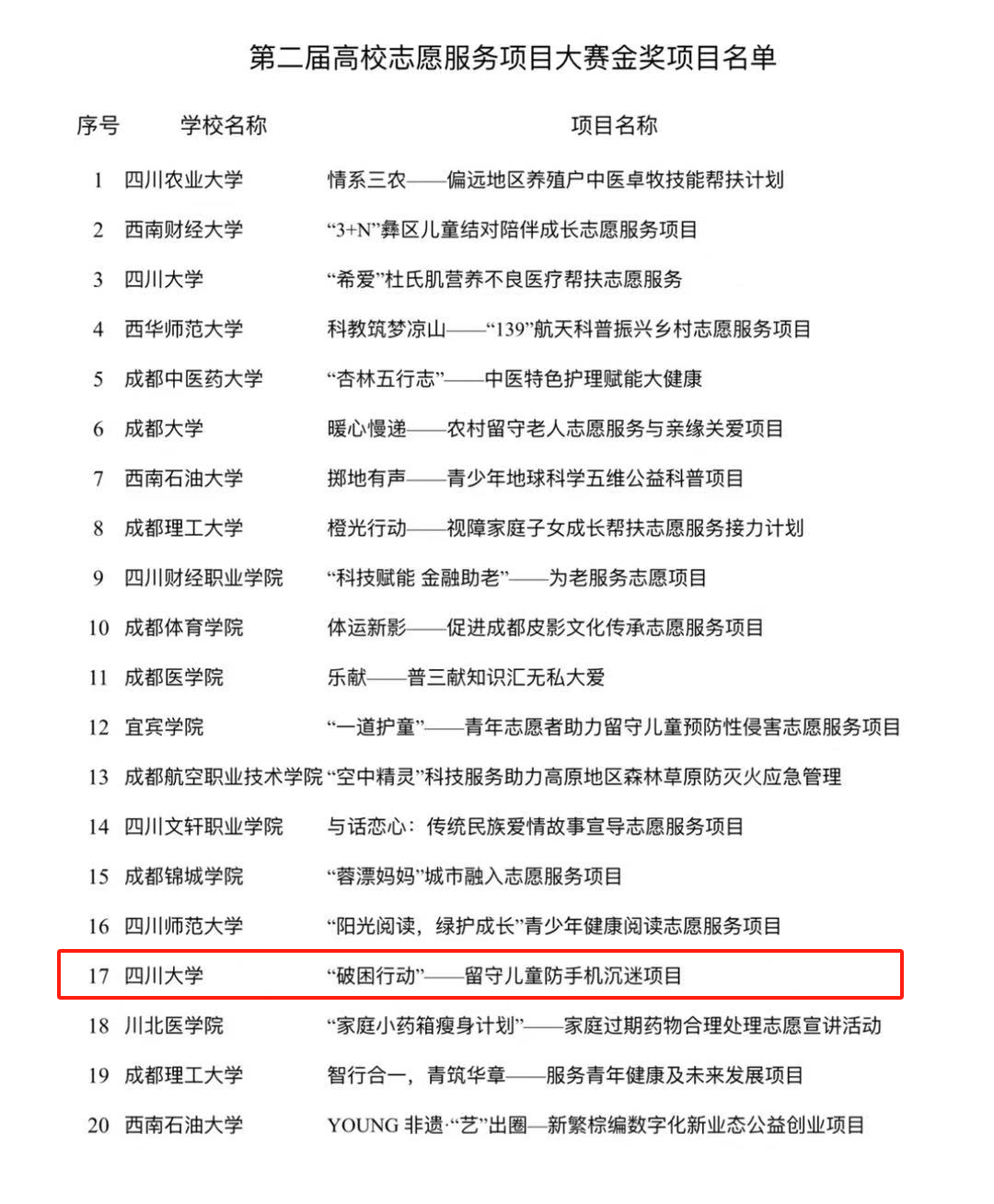 “破困行动”志愿服务项目以2023年暑期社会实践活动为基础参与此项赛事。项目团队同学们为践行党的二十大报告精神,积极响应共青团中央“童心港湾”关爱农村留守儿童的号召,以青年视角关注和缓解留守儿童手机沉迷问题,于2023年8月11日至8月26日在四川省眉山市彭山区谢家街道,驻守社区开展了为期16天的“破困行动”留守儿童手机防沉迷志愿活动。