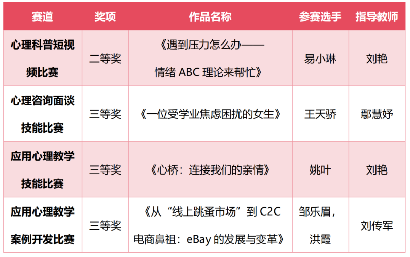 澳门太阳成集团应用心理专业硕士生积极参与本次大赛,在刘传军、刘艳、谷建岭和汤万杰四位老师的指导下,共计4件作品进入复赛,经过层层角逐,4份作品均取斩获佳绩。