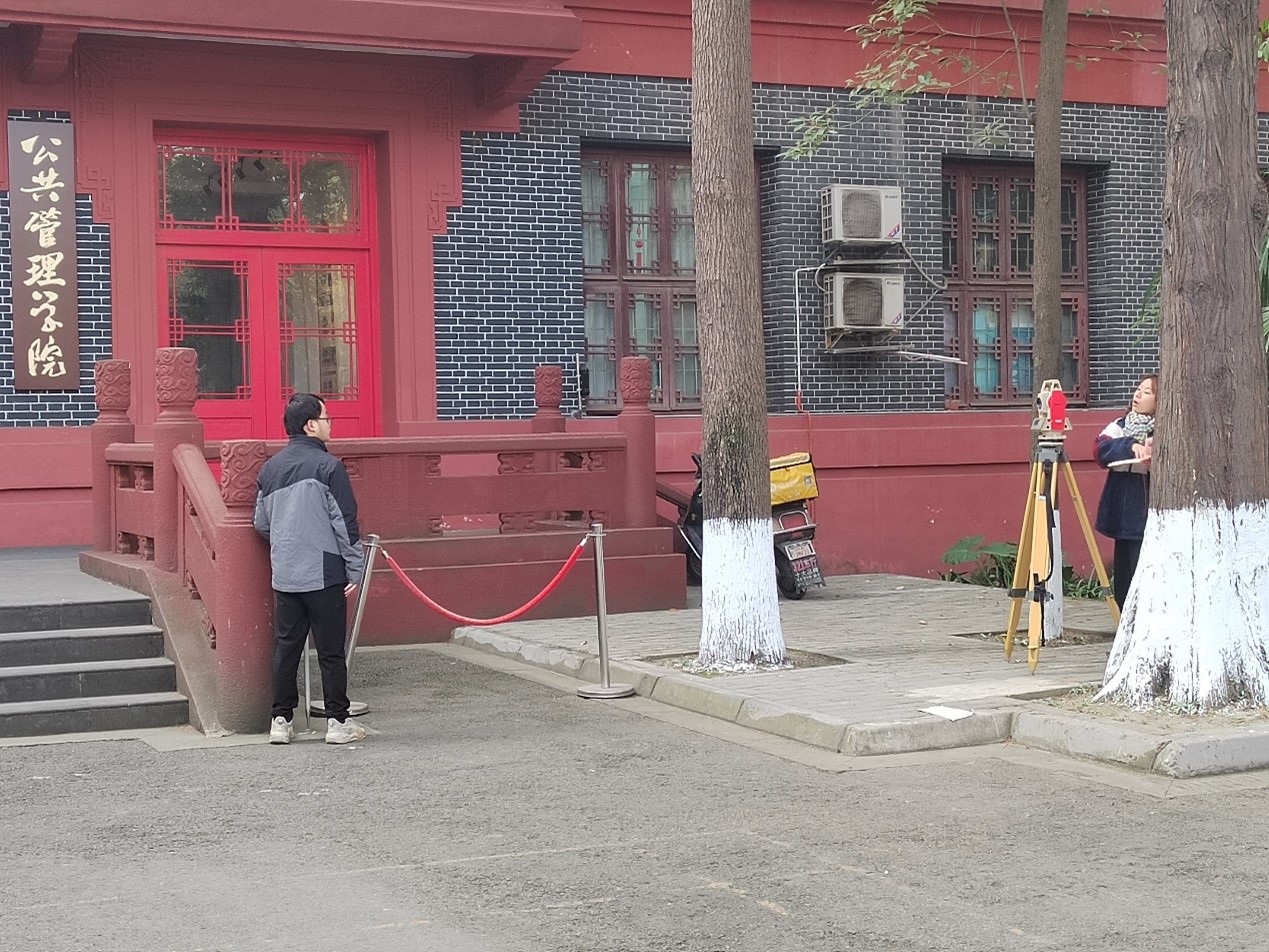 同学们在学院214教室聆听比赛注意事项后领取仪器前往指定测绘地点。各小组通过紧密的分工合作,架设仪器、对中整平、放置目标、校对调整等有序进行。认真严谨的态度真正做到了“步步有检核”。