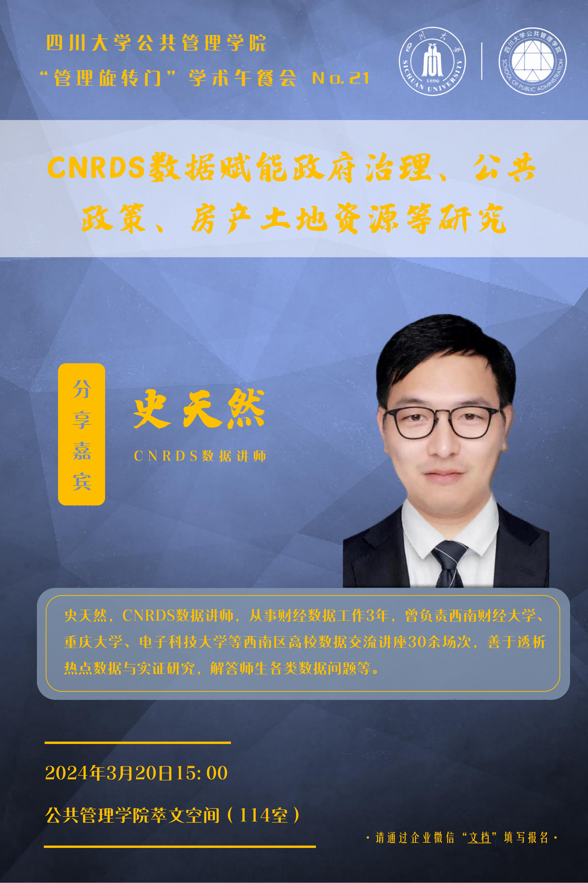 近日,澳门太阳成集团在学院萃文空间成功举办第21期“管理旋转门”学术沙龙。本次活动特邀CNRDS(中国研究数据服务平台)数据讲师史天然老师进行了题为“CNRDS数据赋能政府治理、公共政策、房产土地资源等研究”的学术分享。本期学术沙龙由行政管理系刘磊教授担任学术主持。