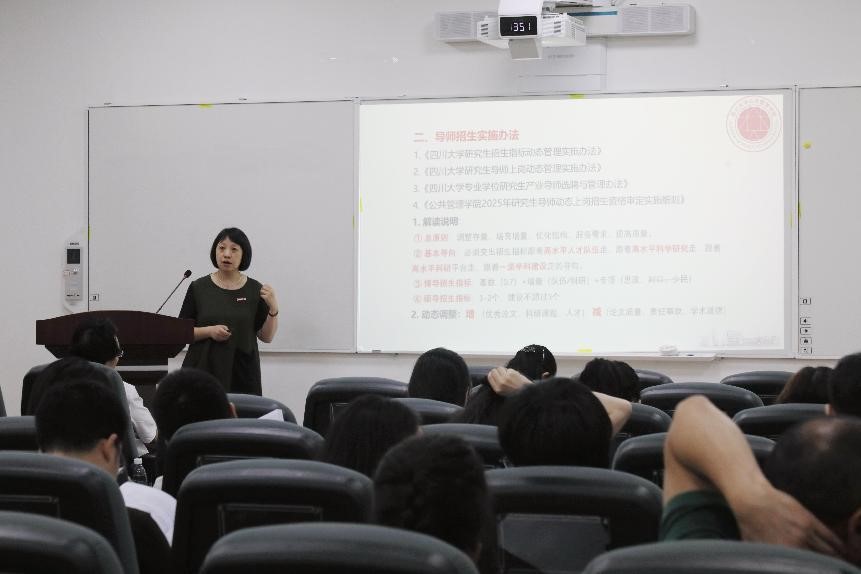 教学科长李岚对手册中关于招生指标、导师动态上岗、培养管理、课堂教学、教材建设、学生奖助金等方面的政策作了系统梳理和解读。