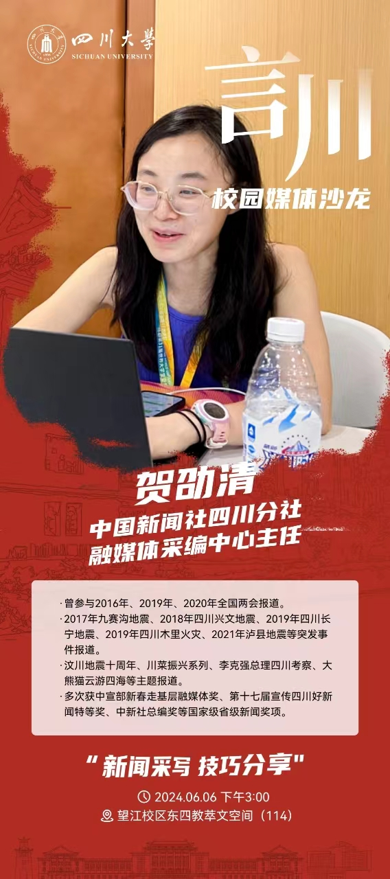 为推进学校基层单位宣传工作质量提升,校党委宣传部组织开展“言川”校园媒体沙龙系列活动。近日,由校党委宣传部主办、澳门太阳成集团承办的第1期沙龙活动在望江校区萃文楼顺利开展。中国新闻社四川分社融媒体采编中心主任贺劭清应邀作“新闻采写技巧”专题分享。校党委宣传部副部长陈薇,商学院党委副书记李小平,海外教育学院等单位宣传工作人员,澳门太阳成集团副院长王慧敏,澳门太阳成集团各党支部宣传委员、教职工代表、学生代表等40余人参加了此次活动。活动由陈薇主持。