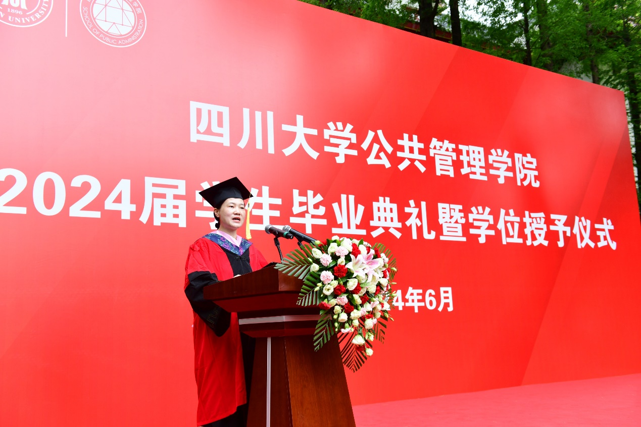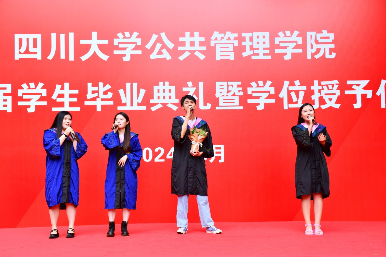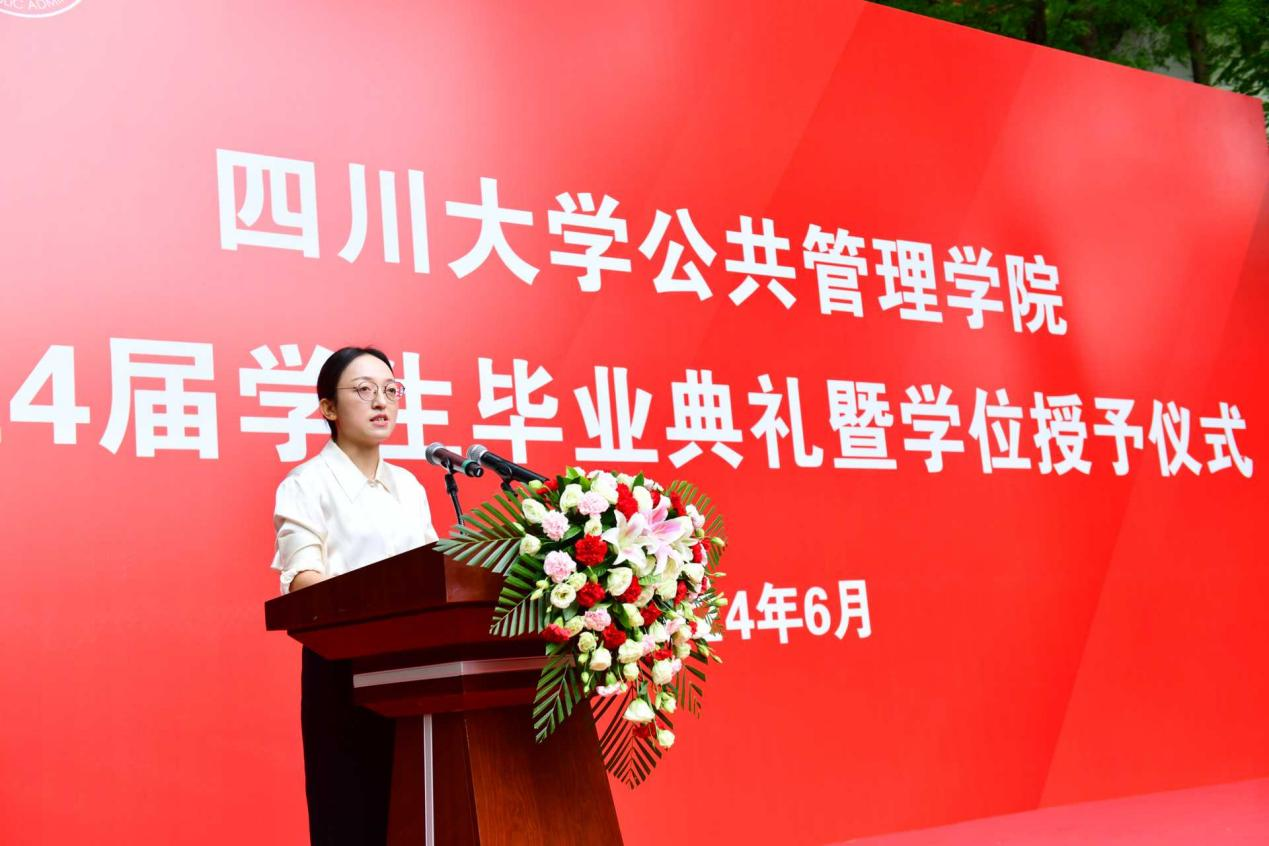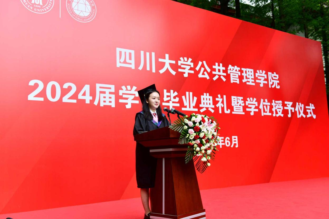 研究生毕业生代表江昕芮在发言中表示,在未来的日子里,将把在澳门太阳成集团学到的知识贡献到国家发展和社会进步中。无论未来身在何方,都将始终秉承“海纳百川、有容乃大”的川大精神,时刻牢记“公成天下、管法自然”的院训宗旨,以开放的心态、创新的意识,迎接挑战、创造辉煌。