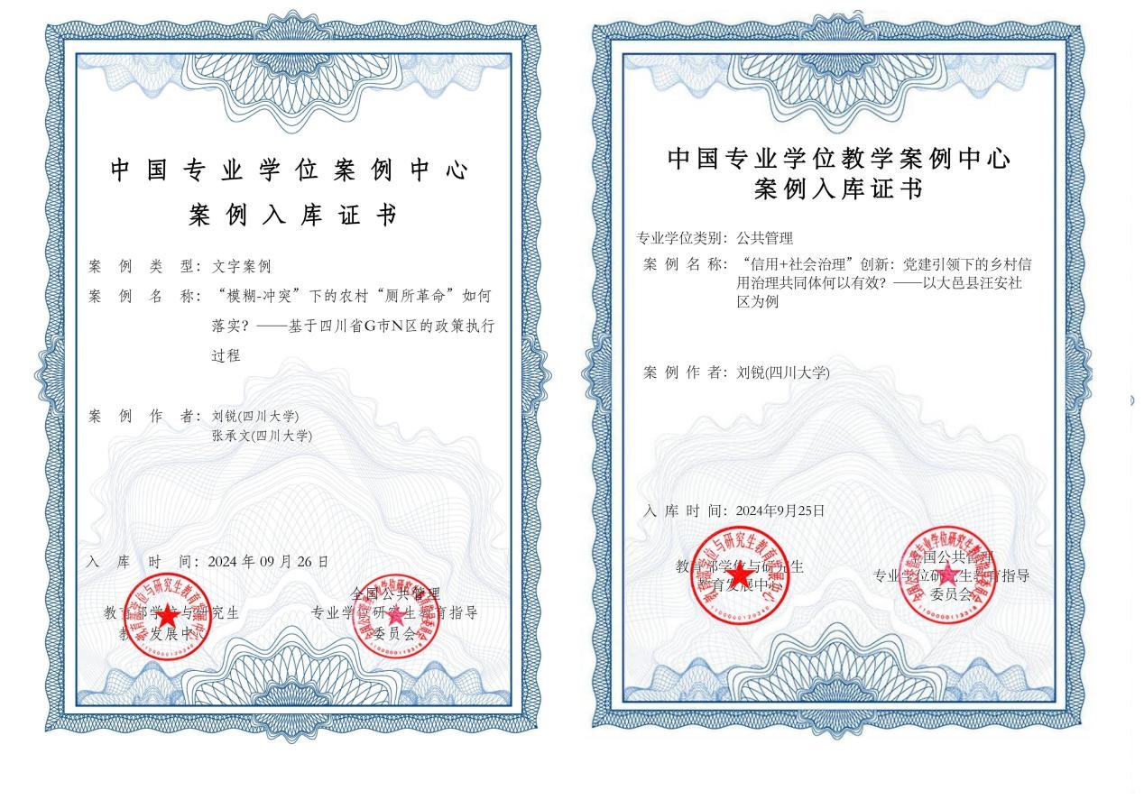 太阳成官网刘锐老师的《“信用+社会治理”创新:党建引领下的乡村信用治理共同体何以有效?—以大邑县汪安社区为例》、《“模糊-冲突”下的农村“厕所革命”如何落实?—基于四川省G市N区的政策执行过程》两个案例成功入库。