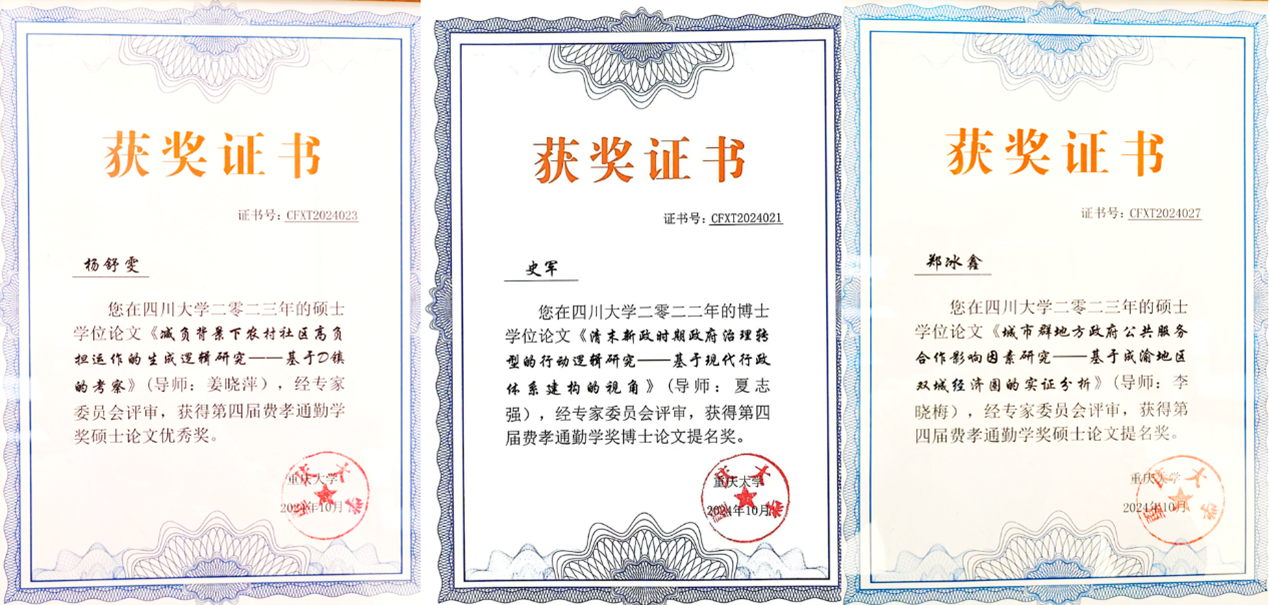其中,2023届硕士杨舒雯撰写的《减负背景下农村社区高负担运作的生成逻辑研究——基于D镇的考察》获得全国唯一优秀硕士学位论文奖(指导教师姜晓萍);2022届博士史军撰写的《清末新政时期政府治理转型的行动逻辑研究——基于现代行政体系建构的视角》获得优秀博士学位论文提名奖(指导教师夏志强);2023届硕士郑冰鑫撰写的《城市群地方政府公共服务合作影响因素研究——基于成渝地区双城经济圈的实证分析》获得优秀硕士学位论文提名奖(指导教师李晓梅)。