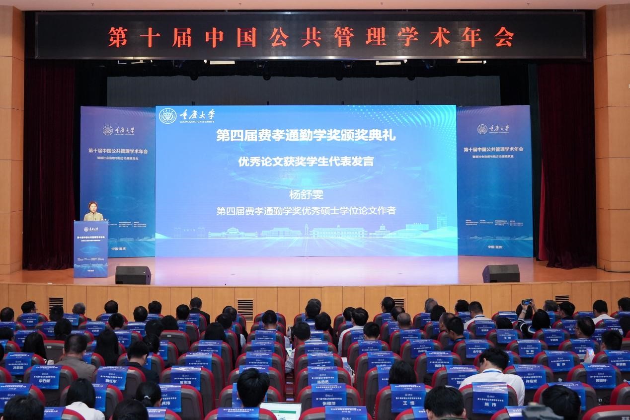 杨舒雯同学作为获奖学生代表在颁奖典礼上发言并表达了扎根田野的学术志愿。她表示作为公管学子,一定努力传承费孝通先生和前辈们的治学态度,继续向下扎根,用心、用文字、用真情把论文写在祖国大地上,讲好中国故事,传播好中国声音。