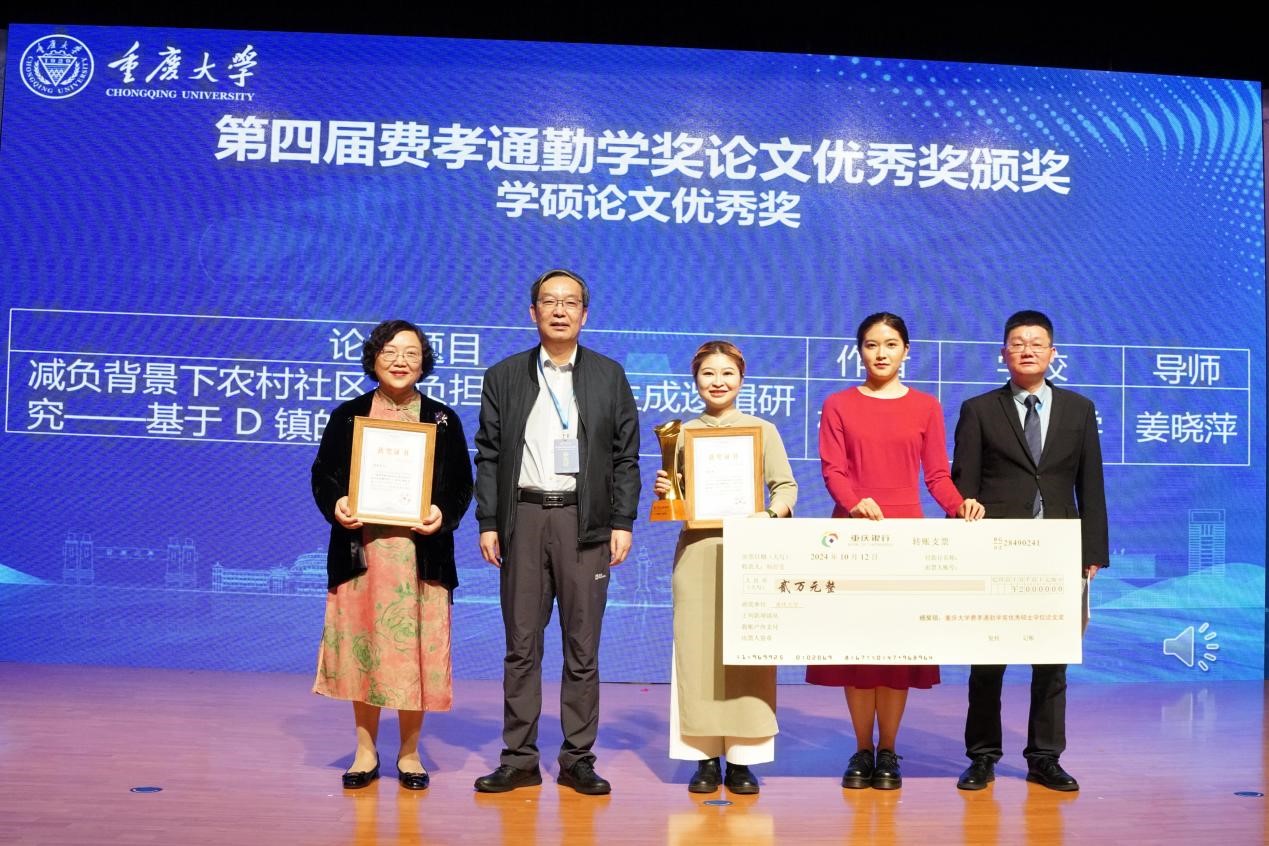 10月12日,第四届“费孝通勤学奖”颁奖典礼在重庆大学举行。继太阳成官网2020届硕士白浩然同学获得第三届“费孝通勤学奖”唯一优秀硕士学位论文奖(指导教师李晓梅)以来,杨舒雯、史军、郑冰鑫3位同学在本届评选中再创佳绩。