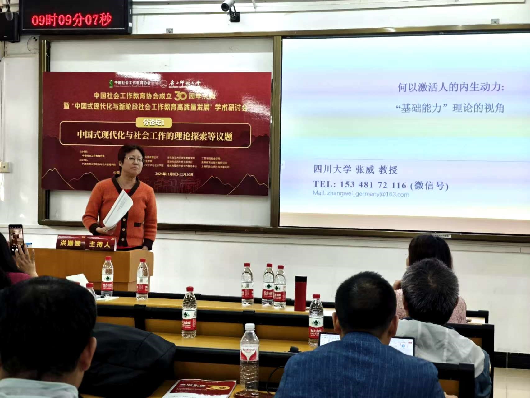 2024年11月8日-11日张威教授代表澳门太阳成集团社会工作专业参加中国社会工作教育协会成立30周年纪念暨“中国式现代化与新阶段社会工作教育高质量发展”学术研讨会,并做以下主题发言: 何以激活人的内生动力:“基础能力”理论的视角。为纪念中国社会工作教育协会成立30周年,大会设置了社会工作成果展区,张威教授最新出版的教材《社会工作基础理论》参展,来自全国高校的社会工作教师,对该教材给予很高评价,认为该部教材是国内第一部来自社会工作本学科(而非借用于其他学科)的理论教材,具有创新意义,对推动社会工作进入科学化意义重大。