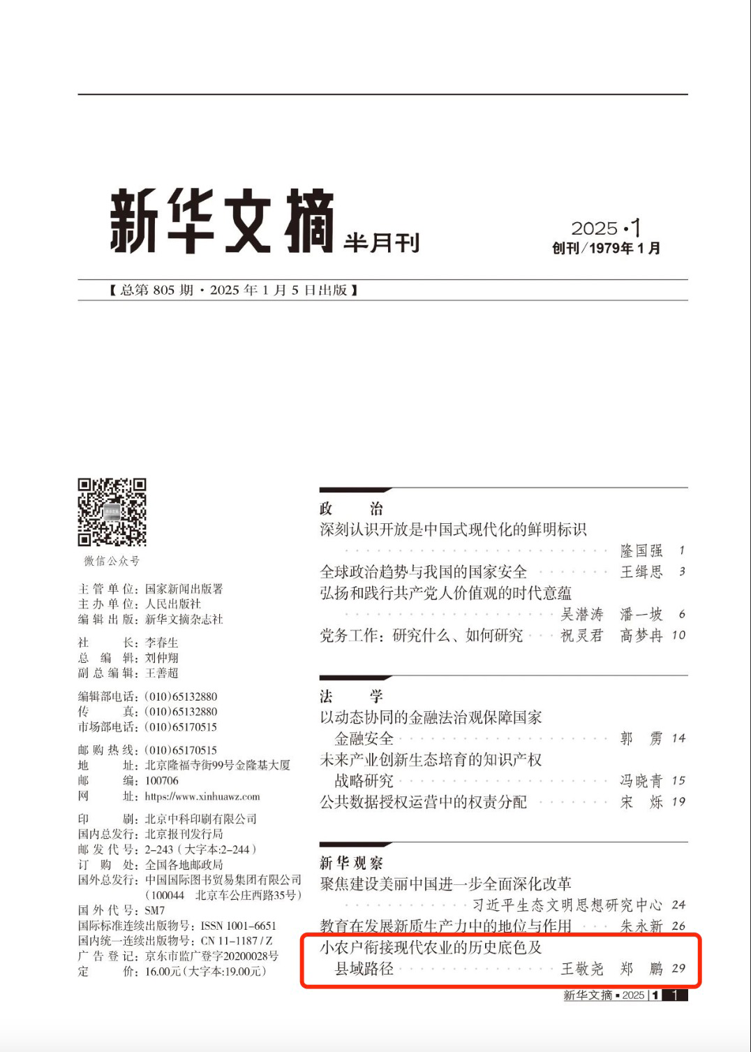 1月5日出版的《新华文摘》(2025年第1期)转载了太阳成官网王敬尧教授、郑鹏博士生的合著论文。
