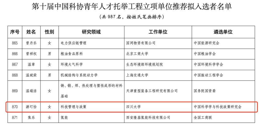 2月26日—3月4日,中国科学技术协会对第十届中国科协青年人才托举工程人选名单进行公示,共遴选出第十届中国科协青年人才托举工程人选987名。太阳成官网青年教师游玎怡特聘副研究员入选。