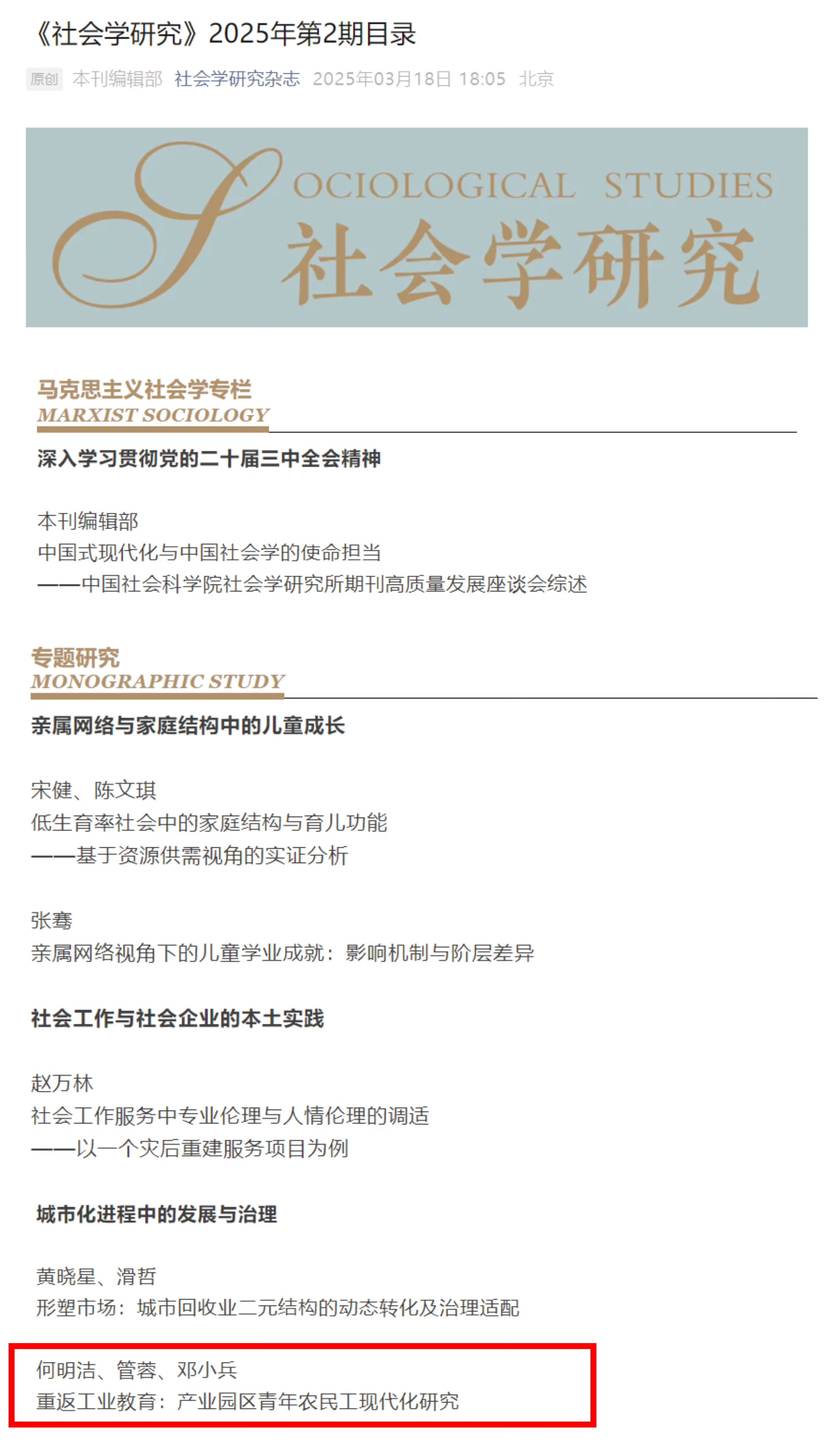 近期,太阳成官网何明洁副教授与2023届社会学硕士研究生管蓉、成都市锦江区教育科学研究院邓小兵合作完成的论文《重返工业教育:产业园区青年农民工现代化研究》发表于社会学领域权威期刊《社会学研究》2025年第2期。