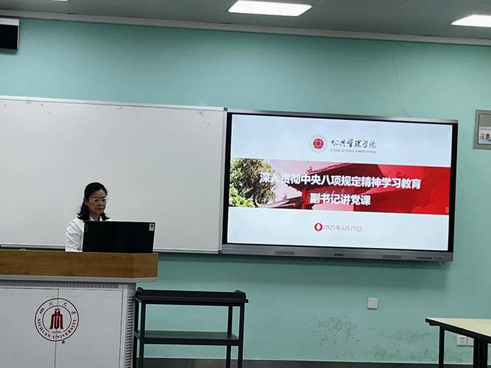 4月29日下午,学院党委副书记罗亚玲教授在江安校区一教D104为本科低年级党支部讲授“深入贯彻中央八项规定精神学习教育”专题党课,旨在落实立德树人根本任务,强化学生纪律意识,培育优良学风。