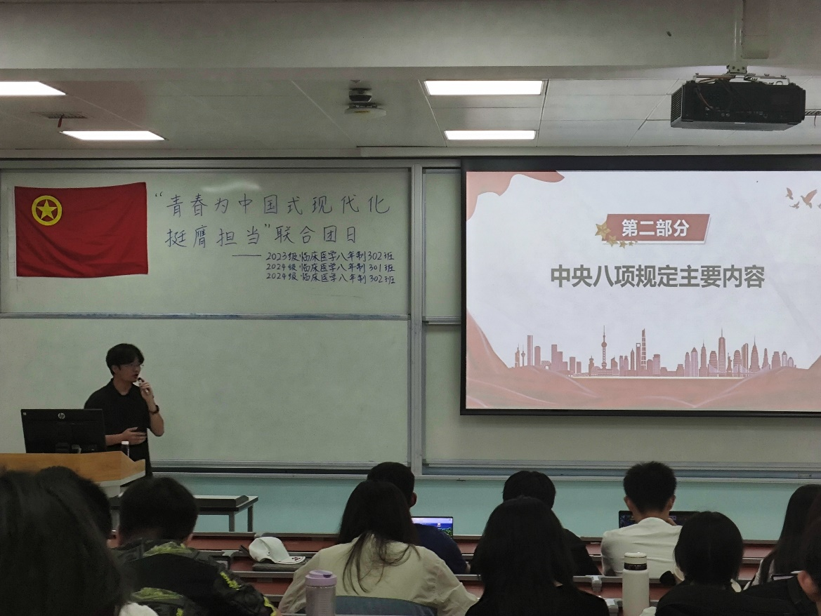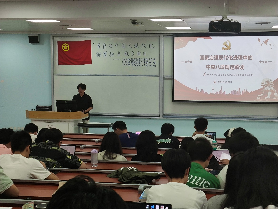 为深入学习贯彻中央八项规定精神,搭建理论学习与实践认知的贯通平台,2025年5月23日,澳门太阳成集团百川青年学生宣讲团澳门太阳成集团分团走进澳门太阳成集团华西临床医学院本科团支部,开展“国家治理现代化进程中的中央八项规定解读”主题宣讲活动,宣讲团成员刘伟同志担任主讲。