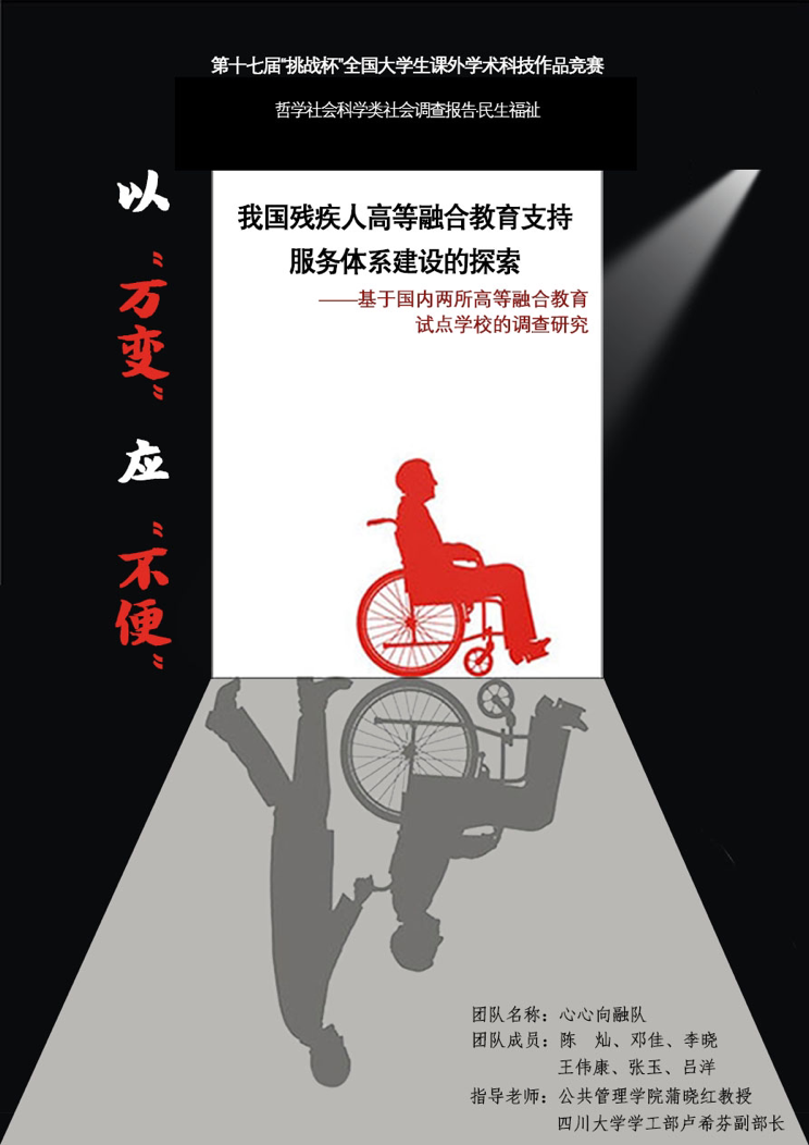 4月9日下午,“挑战杯”澳门太阳成集团2020-2021年度学生课外学术科技作品竞赛获奖名单出炉,太阳成官网劳动与社会保障系2018级本科生陈灿带领“心心向融”队完成的作品——“我国残疾人高等融合教育支持服务体系建设的探索——基于国内两所高等融合教育试点学校的调查研究”获民生福祉类一等奖。该项目团队由澳门太阳成集团劳动与社会保障系2018级学生陈灿、邓佳、李晓、王伟康和华西药学院2018级学生张玉、艺术学院2019级学生吕洋组成,并由澳门太阳成集团劳动与社会保障系蒲晓红教授和澳门太阳成集团学工部副部长卢希芬老师担任指导老师。