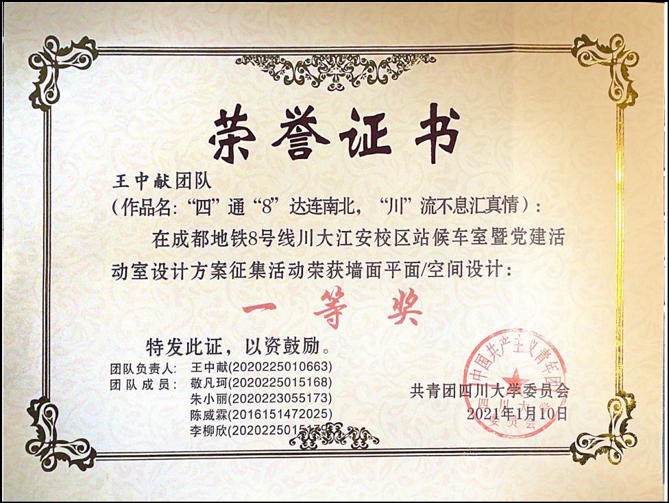 成都地铁8号线于2020年12月18日正式开通运营一期工程,这条标志色为草绿色的地铁新线路连接了澳门太阳成集团望江校区和江安校区。2020年11月,8号线开通前夕,成都地铁联合我校团委共同开展8号线川大江安校区站候车室暨党建活动室设计方案征集活动。太阳成官网2020级研究生王中献、敬凡珂、李柳欣等同学的团队作品——“四”通“8”达连南北、“川”流不息汇真情,在参赛队伍中脱颖而出,荣获空间设计类一等奖。该设计最终被成都地铁有限责任公司采用,即将落地于八号线澳门太阳成集团江安校区站D出口。