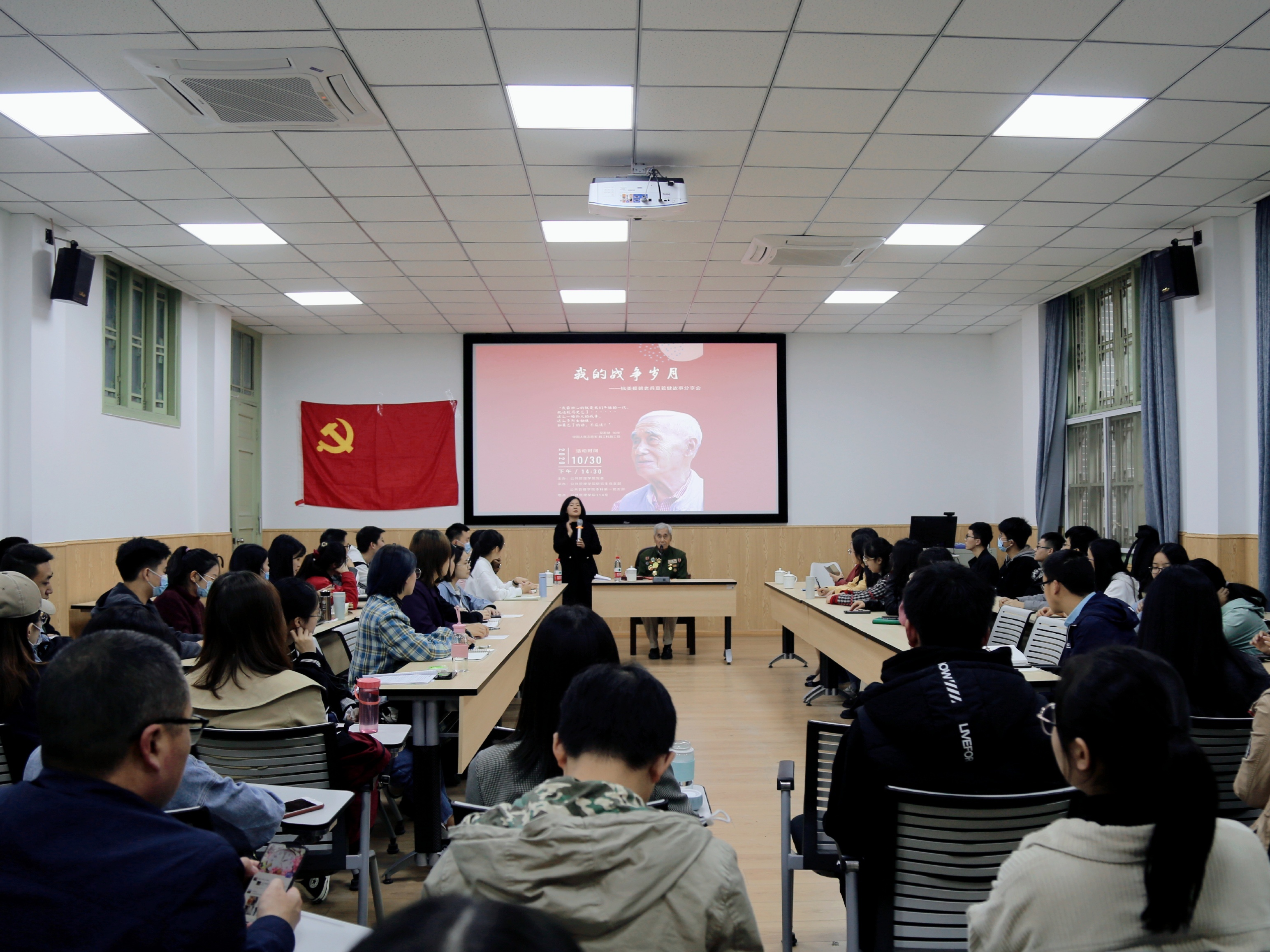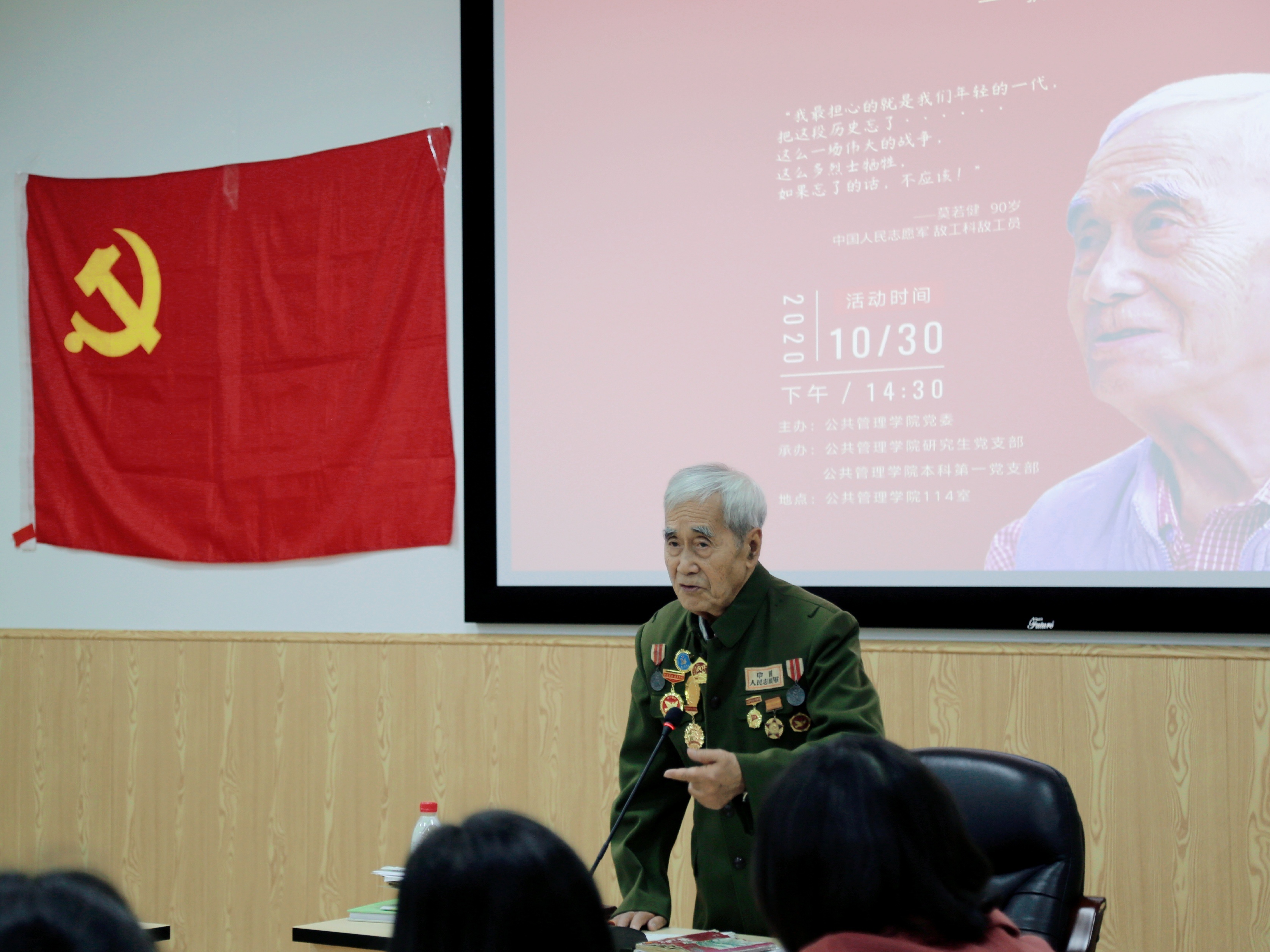 2020年10月30日下午2:30,澳门太阳成集团“我的战争岁月——抗美援朝老兵莫若健故事分享会”主题党日活动在萃文楼114室成功举办,活动由澳门太阳成集团副院长罗亚玲主持,学院专职组织员、2019级研究生第四党支部书记廖海燕,2020级研究生辅导员、本科第一党支部书记陈萱源和部分学生党员参加了此次活动。