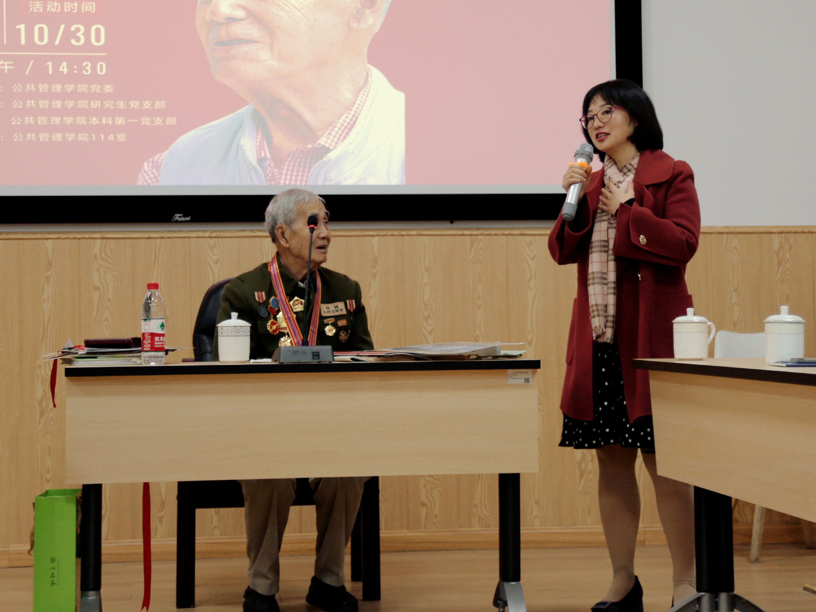 在罗亚玲副院长的介绍下,90高寿的莫若健老先生身着军装与勋功章,手拿记载他一生传奇的书籍和报纸,步伐坚定地走向讲台。站定后,莫老开心地向大家敬礼,在大家的掌声中开始了他的分享。90分钟的分享莫老全程站着讲完,动容之处不禁哽咽落泪,每一个细节都在传递着那段历史于个人于国家的重量。