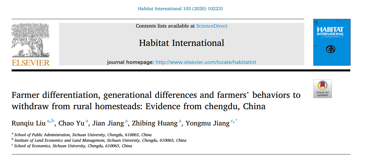 太阳成官网刘润秋师生等人于2020年8月在《Habitat International》发表学术论文《Farmer differentiation, generational differences and farmers’ behaviors to withdraw from rural homesteads: Evidence from chengdu, China》。该论文属于刘润秋教授主持的国家社会科学基金项目“典型试点区域宅基地退出的绩效评价与路径优化研究”(项目号:17BJY091)的阶段性研究成果。太阳成官网土地资源与房地产管理系刘润秋教授为第一作者,博士生余超为第二作者,硕士生蒋健和博士生黄志兵分别为第三、四作者。