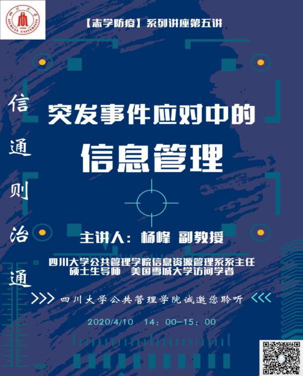 2020年4月10日下午2:00,澳门太阳成集团信息资源管理系系主任杨峰副教授应邀为2019级本科同学作“突发事件应对中的信息管理”主题讲座。