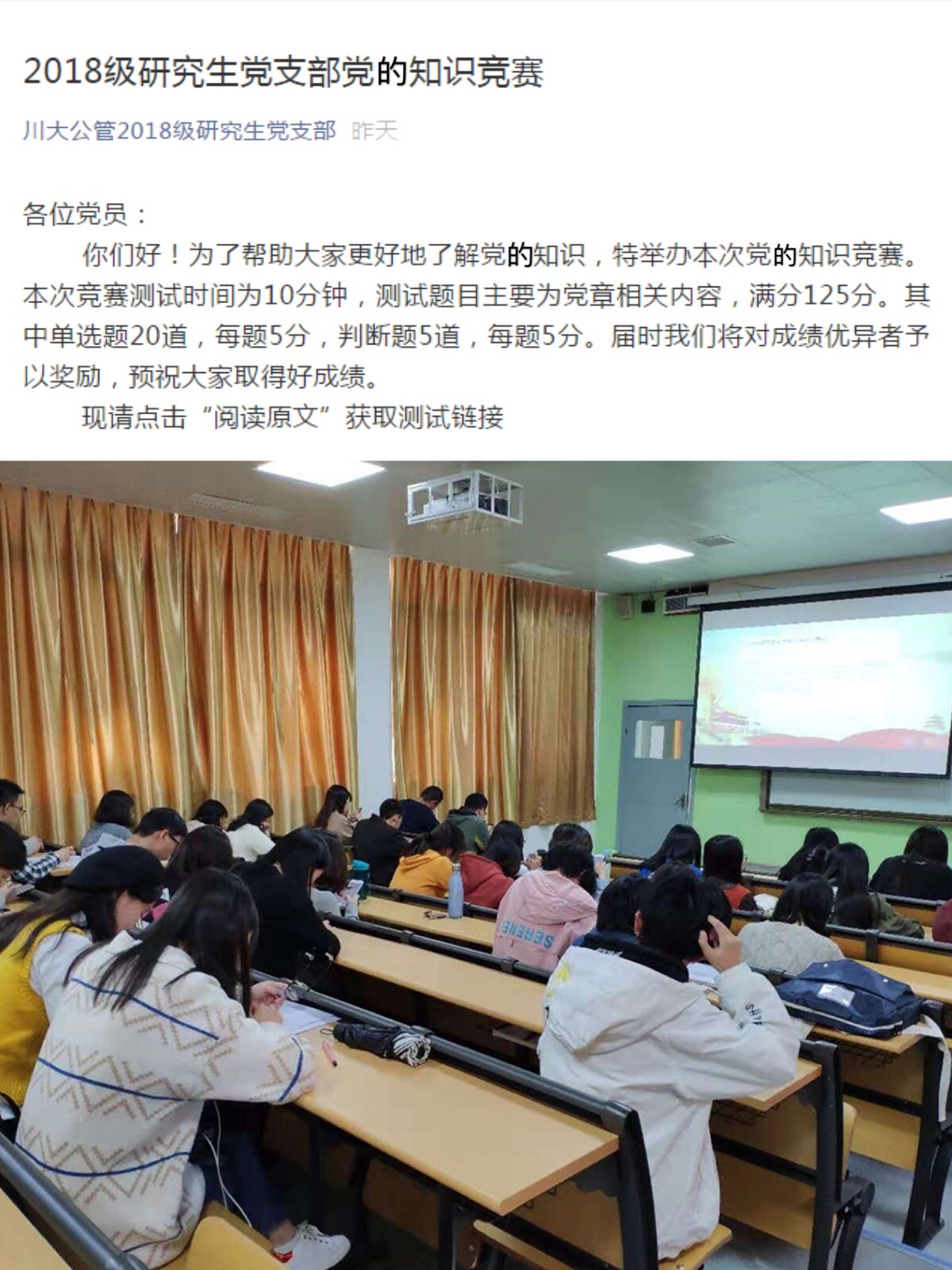 2018年10月31日下午13时,澳门太阳成集团2018级研究生党支部在望江东区第三教学楼149教室开展了 “弘扬红色文化 传承爱国精神”红色印记知识竞赛。