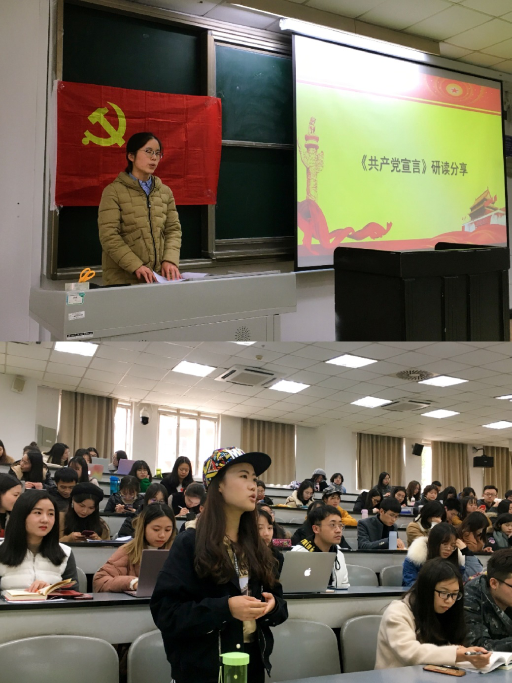 随后,全体党员进入“红色经典”名著研读——《共产党宣言》的学习环节。“红色经典”名著研读活动依托第三支部哲学和宗教学专业党员同志开展,将党建工作与专著研读学习相融合。首先,由澳门太阳成集团2018级研究生第三支部韩洁同志进行《共产党宣言》研读。韩洁同志指出,共产党宣言的诞生标志着马克思主义的诞生,对全世界的无产阶级革命运动起了巨大的推动作用。她从马克思、恩格斯的生平、著作的写作背景、著作的引言和正文四章全面、多维度阐释了《共产党宣言》,并结合我国特点,提出了对新时代中国特色社会主义建设的建议。