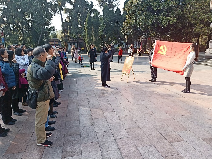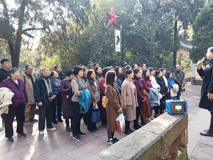 接着党员同志们瞻仰了烈士陵园中的“烈士墓”和“红军坟”。在讲解员的介绍下,党员同志们了解到27岁的原红三军团参谋长邓萍烈士在攻占遵义城战斗时,不幸中弹光荣牺牲的事迹。随后大家仔细聆听了“红军菩萨”的故事:18岁的卫生员龙思泉为给百姓治病贻误了随部队转移的时间,被地主武装杀害,老百姓为了纪念这位卫生员,垒起了一座“红军坟”,并称墓主为“小红”。后来“卫生员小红”的事迹被淳朴的遵义老百姓演变为“红军菩萨”,还在红军坟下塑起了红军菩萨给小孩喂药的铜像。教职工党员同志们被烈士们的事迹深深触动,深感革命胜利来自于党与人民的相互信任和血肉联系。