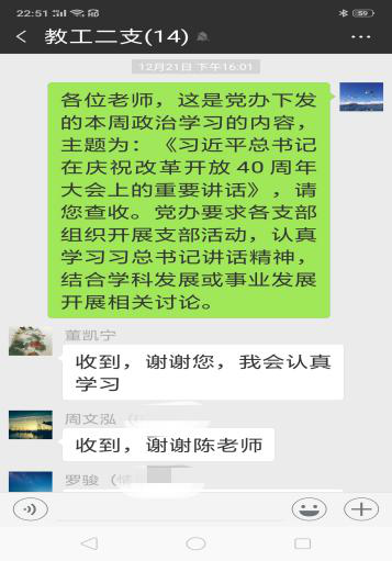 2018年12月21日,按照澳门太阳成集团党委统一要求,教工第二党支部召开学习“习近平总书记在庆祝改革开放40周年大会上的重要讲话精神”主题微信群在线学习交流会。支部全体党员教师参加了本次学习活动。