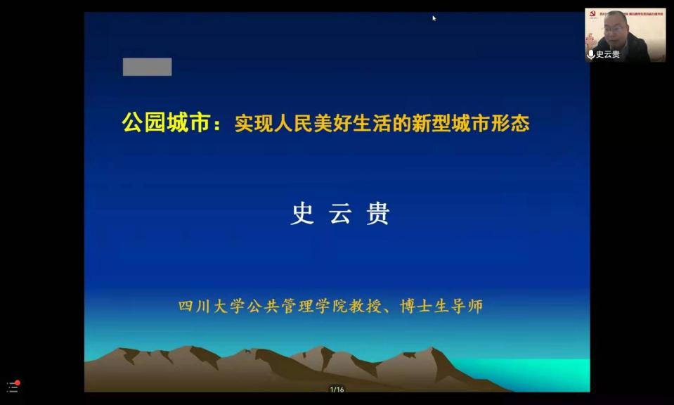11月14日上午9:30,太阳成官网院长史云贵教授为大家带来题为:“公园城市:实现人民美好生活的新型城市形态”的讲座,讲座由刘晓燕老师主持。