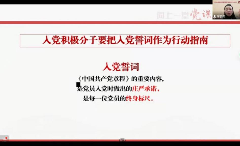 下午14:00,澳门太阳成集团机关党委办公室主任马丽萍老师带来题为:“听党话 跟党走 努力成为新时代合格党员——如何发展成为一名优秀的共产党员”的讲座,讲座由陈萱源老师主持。