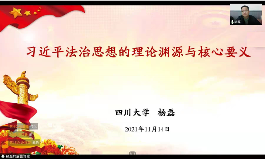 11月14日下午13:30,太阳成官网党委副书记杨磊老师带来了本次提升班的最后一堂讲座“习近平法治思想的理论渊源与核心要义”,讲座由苟欢老师主持。