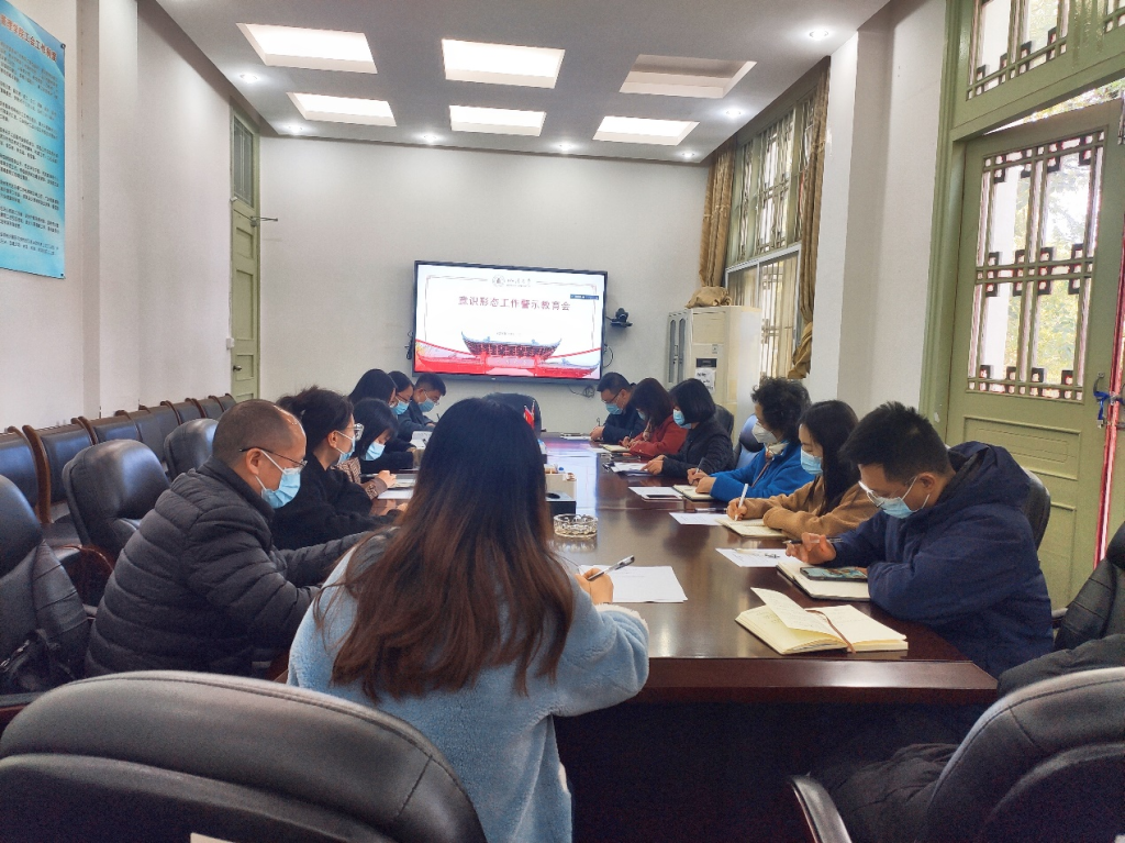 11月11日下午,澳门太阳成集团在萃文楼220会议室召开意识形态工作警示教育会。副院长罗亚玲、学院各党支部书记、各科室负责人参加会议。根据学校防疫要求,会议采取线上与线下相结合的方式进行。