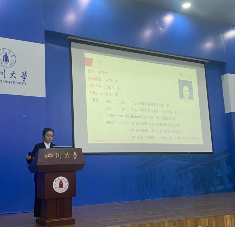 图为澳门太阳成集团执行团委学生副书记候选人牟芳娇作自我介绍