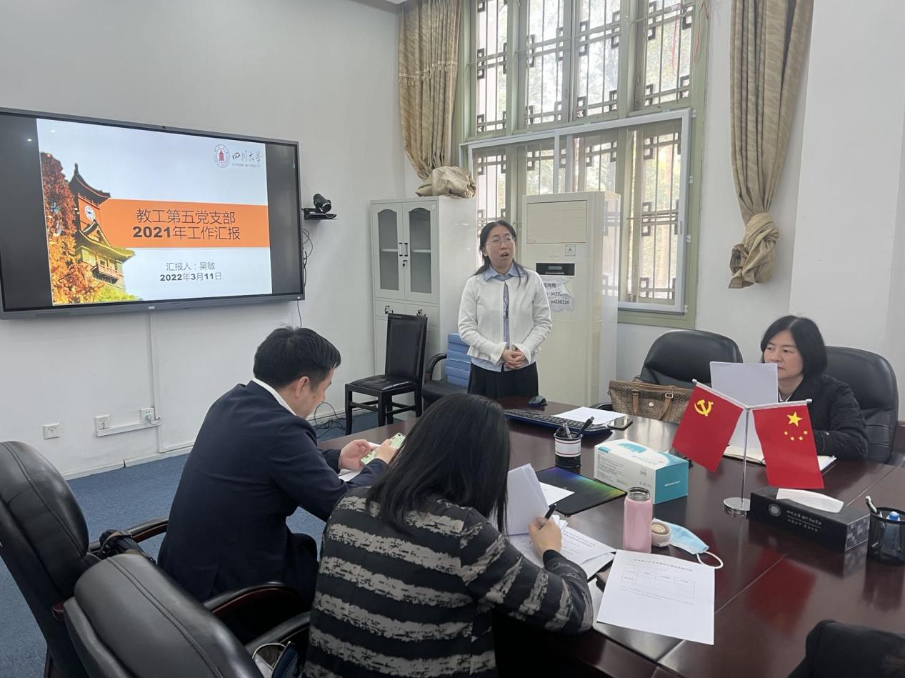 2022年3月11下午,澳门太阳成集团教工第五支部在学院211会议室,开展了2021年度支部组织生活会暨党员民主评议大会,会议由支部书记吴敏教授主持,支部14名党员全体参加会议,学院党委书记韩杰同志莅会指导。