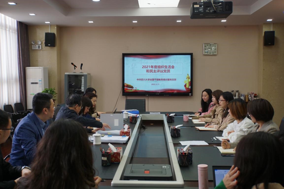 2022年3月11日上午,澳门太阳成集团全国干部教育培训基地党支部在基地200会议室开展了2021年度组织生活会暨党员民主测评大会,会议由支部书记王慧敏同志主持,支部党员全体参加会议,学院党委书记韩杰同志、组织员廖海燕同志莅会指导。