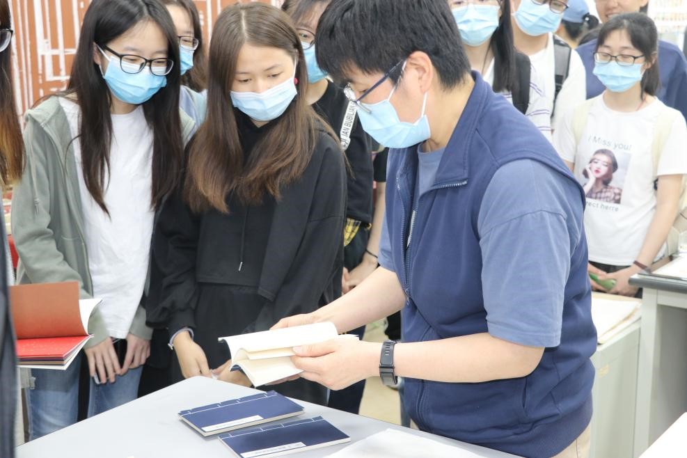 随后,许老师带领同学们跨越千百年与古籍对话,体验古书装帧技艺的演变。从卷轴装到经折装,从经折装到蝴蝶装,从蝴蝶装再到包背装,最后到线装本,可谓“六朝文物草连空,天淡云闲今古同”。