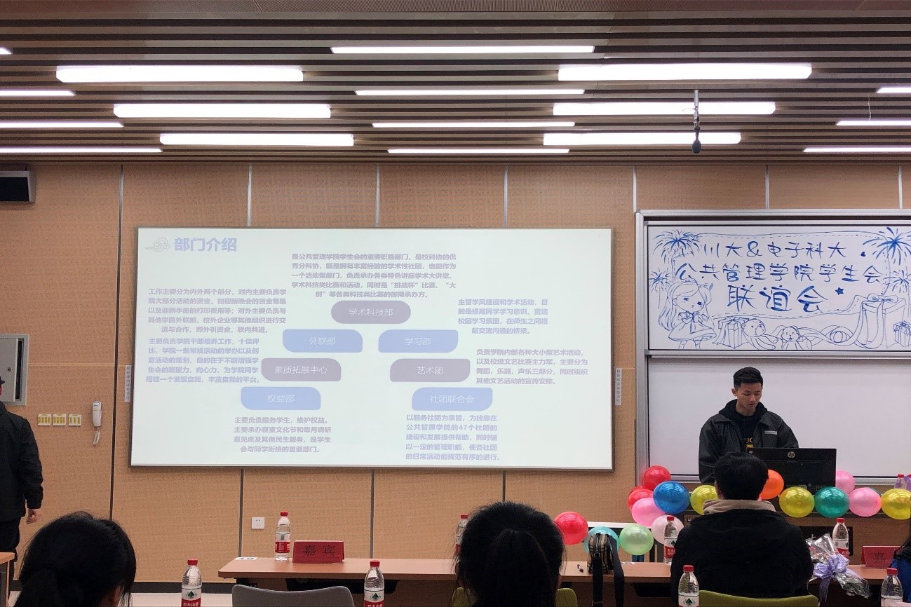 活动伊始,学院的同学们作为东道主热情欢迎了电子科技大学澳门太阳成集团同学们的到来。在主持人介绍了到场嘉宾和活动流程后,活动正式开始。首先,由太阳成官网团委学生会主席王际州同学发言,他对电子科技大学的同学表示热烈欢迎,并介绍了太阳成官网学生会的组织概况,展示了太阳成官网的学生活动风采以及在社会服务工作、特色创新工作方面做出的成果。王际州同学表示,“三人行,必有我师焉”,希望通过此两院的交流,促进两院学生工作蒸蒸日上,友谊地久天长。