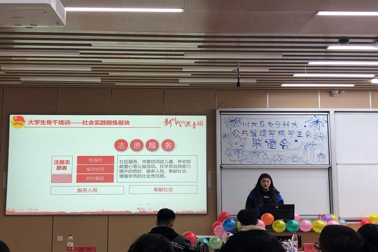 接着,电子科技大学澳门太阳成集团团委副书记孙琳瑛元同学发言。孙同学以“新时代,新作为,新篇章”作为开篇立意,以“新形势下电子科技大学澳门太阳成集团基层团组织工作探索与实践”为主题,系统性地介绍了电子科技大学澳门太阳成集团学生组织架构、大学生骨干培育工程。接下来,由电子科技大学澳门太阳成集团学生会主席崔振鑫及各部门的部长代表上台做发言和展示,分别介绍了各部门职能定位、活动风采、组织建设和创新实践等方面的内容。