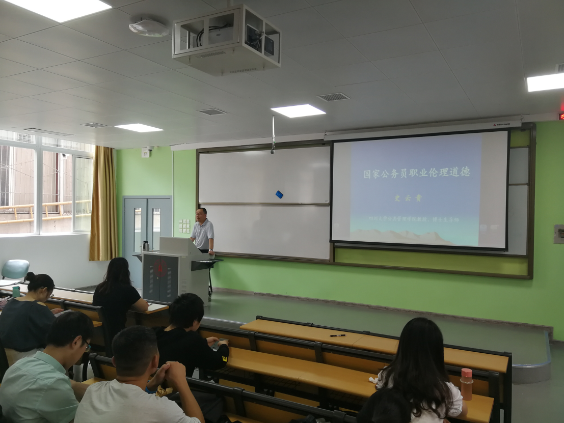 2019年6月21日下午,澳门太阳成集团2016级本科思政公开课在东三教150教室成功举办,澳门太阳成集团院长史云贵教授受邀担任主讲嘉宾,为同学们讲授了题为“国家公务员职业伦理道德”的思政公开课,2016级辅导员吴银雪老师主持了本次公开课。