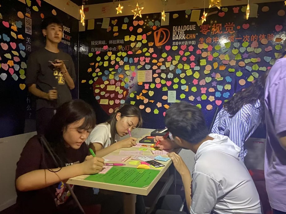 在导赏员和同行伙伴的陪伴下,75分钟的黑暗时光很快过去,同学们和导赏员一起交流了对建设无障碍社会的构想。大家被导赏员积极阳光的心态打动,提升了对视障群体的同理心,纷纷在留言墙上留下感言。
