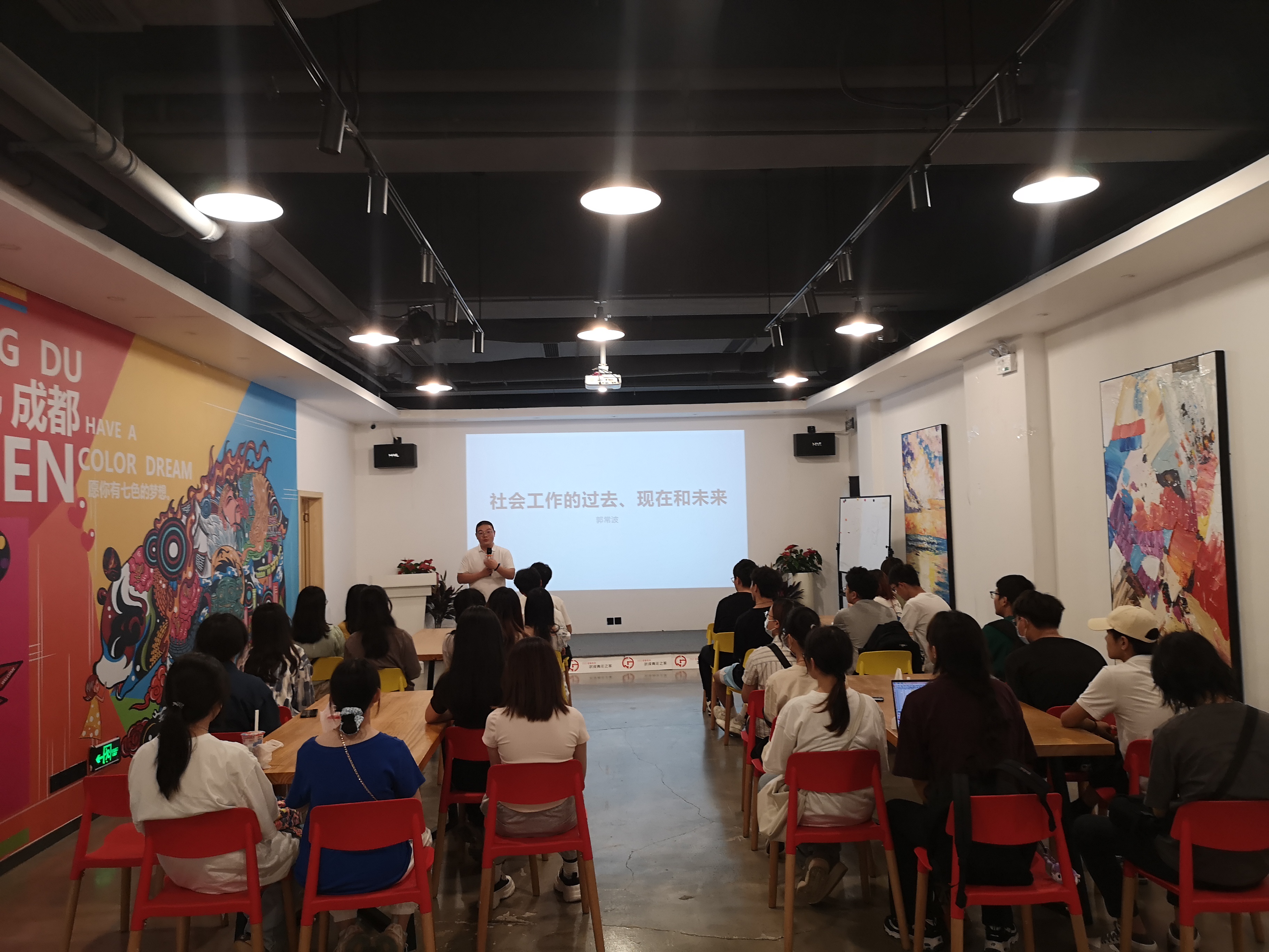 为了使同学们在课堂外进一步了解专业社区工作的产生和发展过程,深度剖析社会工作行业发展过程中形成的社会困境及其解决之道,增加《社会心理学》关于社会困境有关知识的感性体验,太阳成官网2022级社会工作本科生在刘传军老师的带领下,于6月8日下午来到成都市武侯区青年之家、武侯区聚落青年服务中心,进行《社会心理学》课程实践教学活动。武侯区聚落青年服务中心负责人、实务授课郭常波老师为本次实践交流做了精心准备,以“社会工作的过去、现在和未来”为题交流了他对整个行业发展的观察和体会,以“从我的历程回观社工机构的异化”为题交流了他关于行业和机构发展困境及其破解之道的见解。