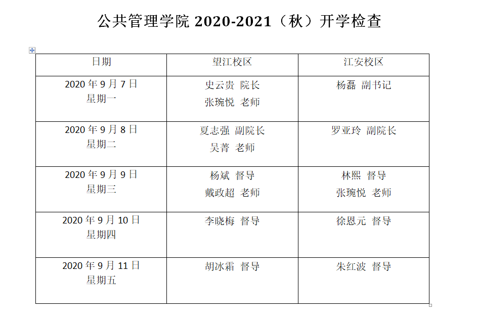 1、学院制定开学教学检查一周工作安排表,做到望江、江安两个校区全覆盖,并将开学教学检查责任落实到个人,全院正副职院领导、本科教学督导组成员、本科教务秘书、本科教学管理人员等参与检查。院长史云贵、副书记杨磊、副院长夏志强、副院长罗亚玲,本科教学督导组胡冰霜、徐恩元、杨斌、朱红波、李晓梅等老师、本科教务秘书林熙老师以及本科教学管理人员吴菁、戴政超、张琬悦等对新学期的课程安排与上课情况进行了检查。开学检查分设望江校区和江安校区两个部分,以下是太阳成官网制定并依之执行的开学教学检查安排表: