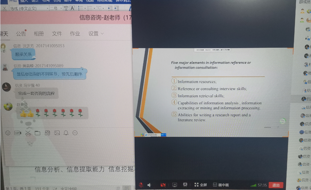 从任课教师反馈来看,《信息咨询》任课教师赵媛教授谈道“第一次的网课整体感觉不错,学生都准时上线、QQ视频和语音清晰流畅,学生互动情况非常好,取得了一些意想不到的效果”,她还进一步指出,线上教学有多方面的优点:一是同学们在课堂互动中不好用语音表达的可以转为文字表达,这样既利于同学克服紧张情绪,又利于全体同学查看和师生立即点评回复,触发激烈讨论;二是可以用表情包缓解和活跃课堂氛围,拉近和学生距离;三是网上教学方便学生随时上网查资料、回答问题和参与互动讨论。同时,她也指出网上教学也有和学生不能做直观的交流、无法实时监督学生学习状态等不足。