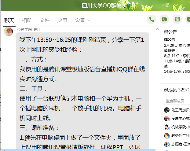 又如史江教授所授的《档案管理学》课程,史江教授采用腾讯课堂极速版语音直播+QQ群分组讨论多形式结合的方式展开教学。她使用了一台联想笔记本电脑和一个耳机,一个华为手机和手机托板,电脑和手机同时上线,预先在电脑桌面建一个文件夹放上课用的腾讯课堂极速版软件、课程PPT、资料、图片、小视频等。她利用腾讯课堂邀请码正式开启课堂,通过屏幕分享、语音讲述、QQ群二次分组讨论、课后反馈调查等环节将第一堂课流利顺畅的完成。在课程结束后,她立即编写第一次线上教学经验,面向学校、学院同事QQ群分享交流,为院内外同事提供了宝贵的经验。