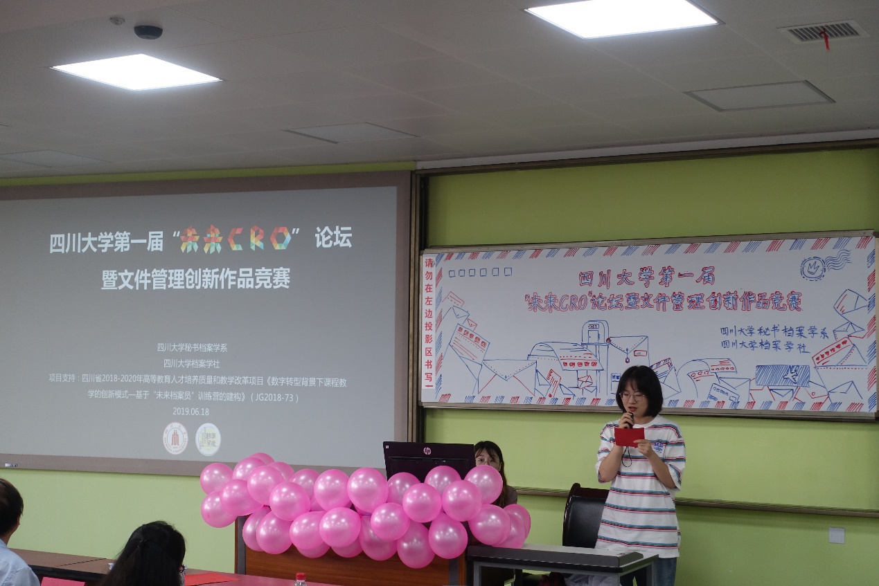 2019年6月18日下午13:00-18:30,澳门太阳成集团秘书档案学系、澳门太阳成集团档案学社于江安校区一教B301成功举办澳门太阳成集团第一届“未来CRO”论坛暨文件管理创新作品竞赛活动。本次活动依托四川省2018-2020年高等教育人才培养质量和教学改革项目《数字转型背景下课程教学的创新模式—基于“未来档案员”训练营的建构》与本科一年级文书学课程开展,由王萍副教授与周文泓副教授联合负责,旨在培育学生的研究能力,以促进专业建构同新时代本科教育改革与发展精神的融合。为期两月的活动于4月16日正式启动。78名同学在教师与学生导师的指导下,参照科学竞赛作品的规范流程,通过前期培训、开题、研究方案设计、全过程研究、研究报告写作、研究成果展示等形成10组文件管理作品。当天是本次活动的最终成果汇报展示,秘书档案学系乔健教授、王萍副教授、周文泓副教授担任评委。