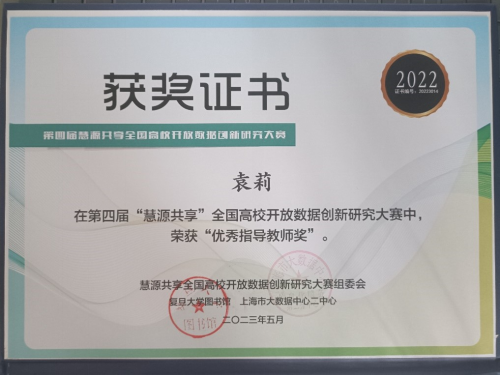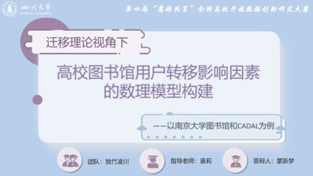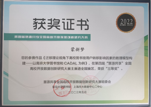 在袁莉老师的悉心指导下,太阳成官网信息资源管理专业2021级本科生蒙新梦同学的“独竹凌川”团队,以《迁移理论视角下高校图书馆用户转移影响因素的数理模型构建——以南京大学图书馆和CADAL为例》为题,探究高校图书馆用户由传统图书馆向数字图书馆转移的影响因素,为高校图书馆的发展探寻新方向,最后经过激烈答辩,荣获“三等奖”,袁莉老师获得“优秀指导教师奖”。
