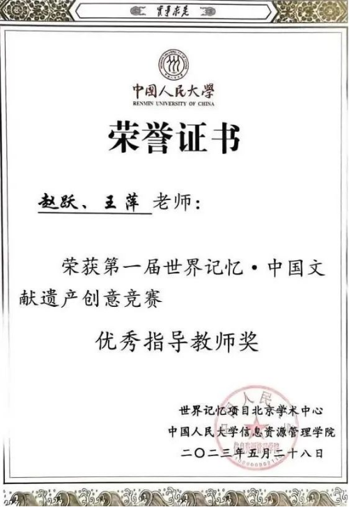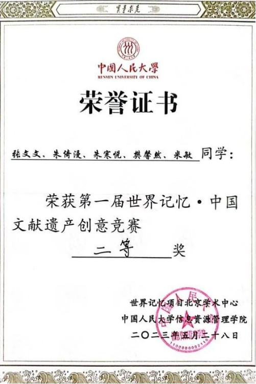 太阳成官网档案学专业本科生团队喜获“世界记忆•中国文献遗产创意竞赛”二等奖