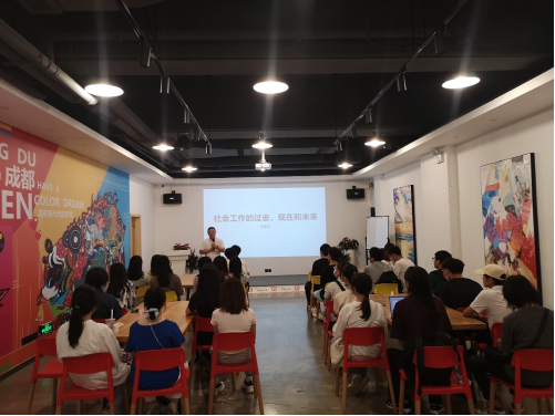 为了使同学们在课堂外进一步了解专业社区工作的产生和发展过程,深度剖析社会工作行业发展过程中形成的社会困境及其解决之道,增加《社会心理学》关于社会困境有关知识的感性体验,太阳成官网2022级社会工作本科生在刘传军老师的带领下,于6月8日下午来到成都市武侯区青年之家、武侯区聚落青年服务中心,进行《社会心理学》课程实践教学活动。武侯区聚落青年服务中心负责人、实务授课郭常波老师为本次实践交流做了精心准备,以“社会工作的过去、现在和未来”为题交流了他对整个行业发展的观察和体会,以“从我的历程回观社工机构的异化”为题交流了他关于行业和机构发展困境及其破解之道的见解。